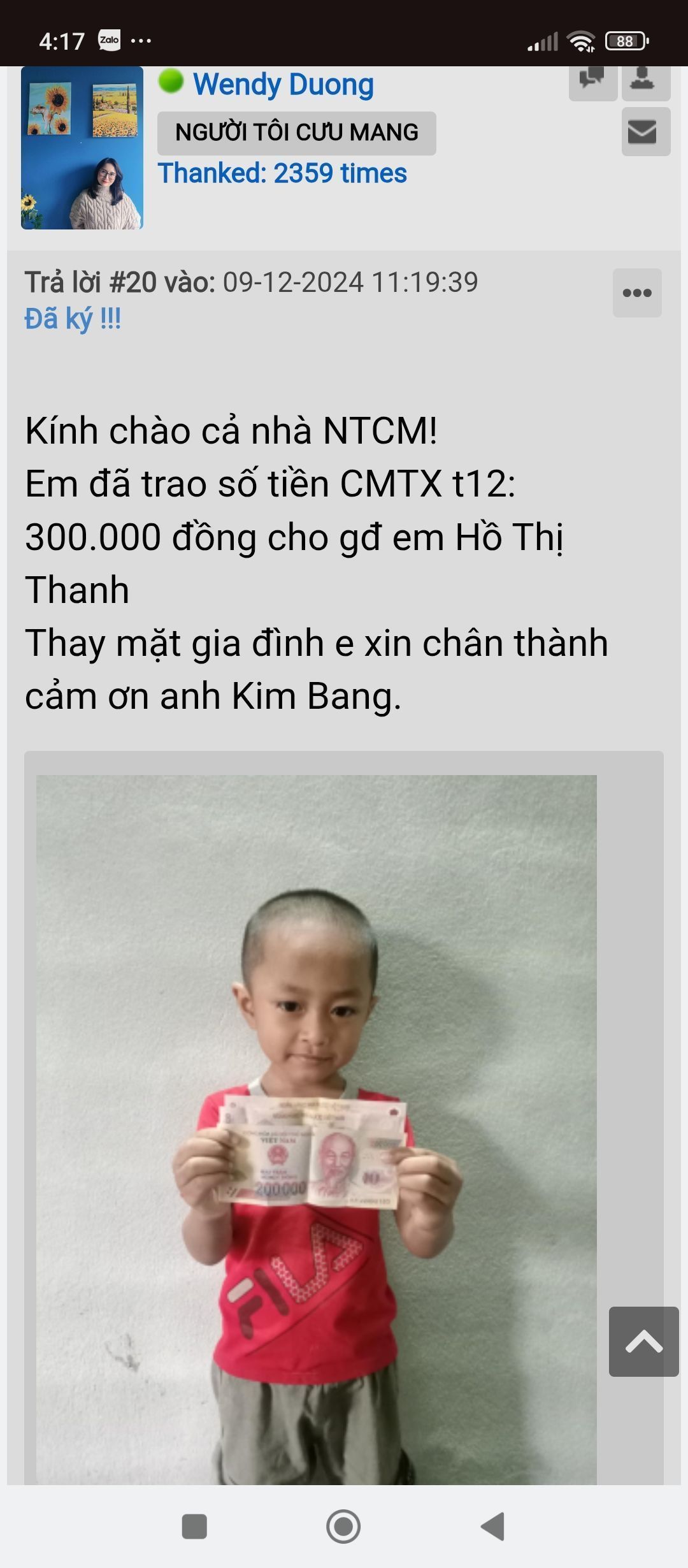 Dạ e đã trao đủ 2 triệu đồng cho gđ e Thanh.