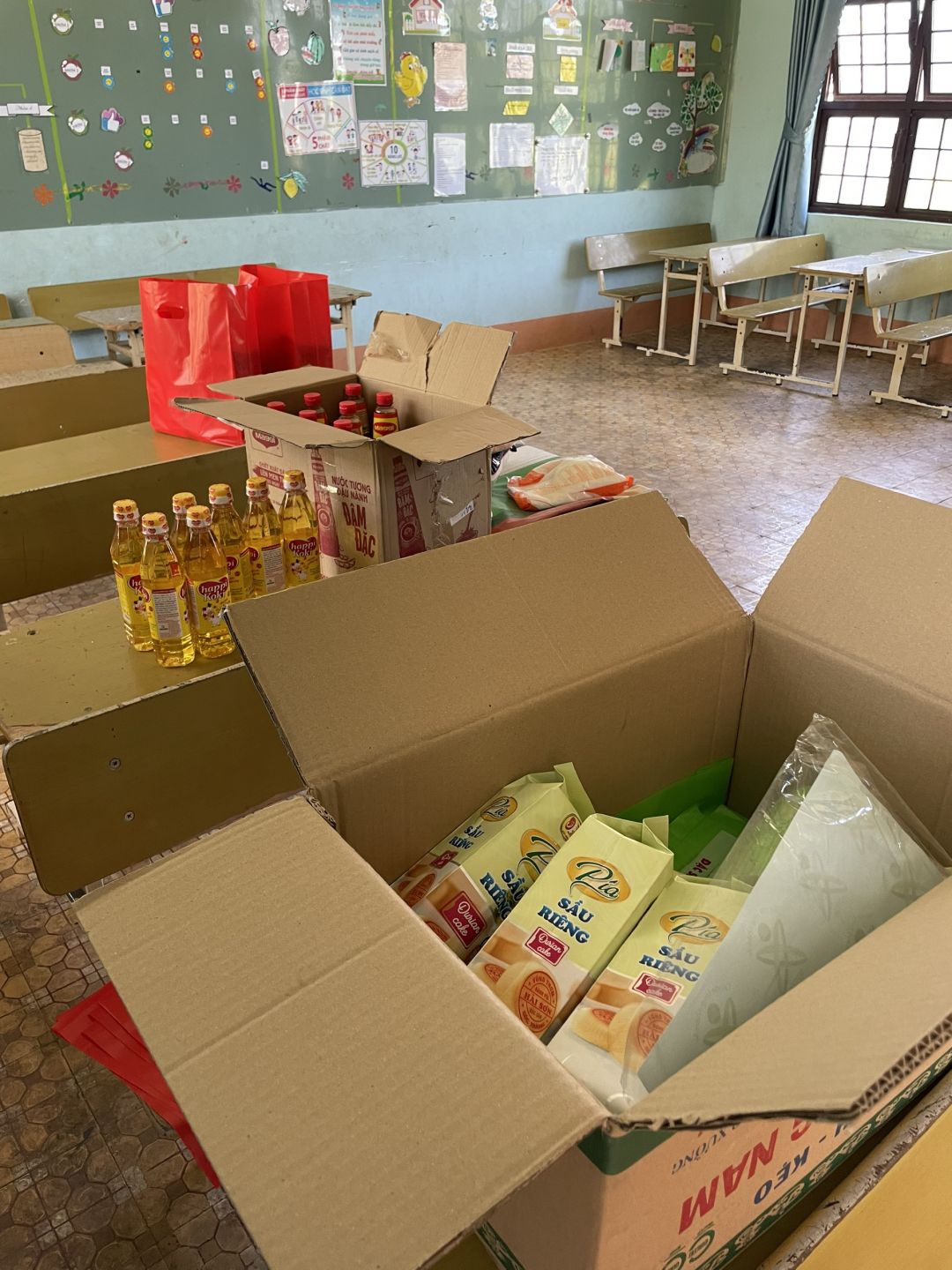 : 300.000đ tiền mặt, 20kg gạo, 1 bịch bánh pía, nhu yếu phẩm (muối, đường, nước tương, bột ngọt)