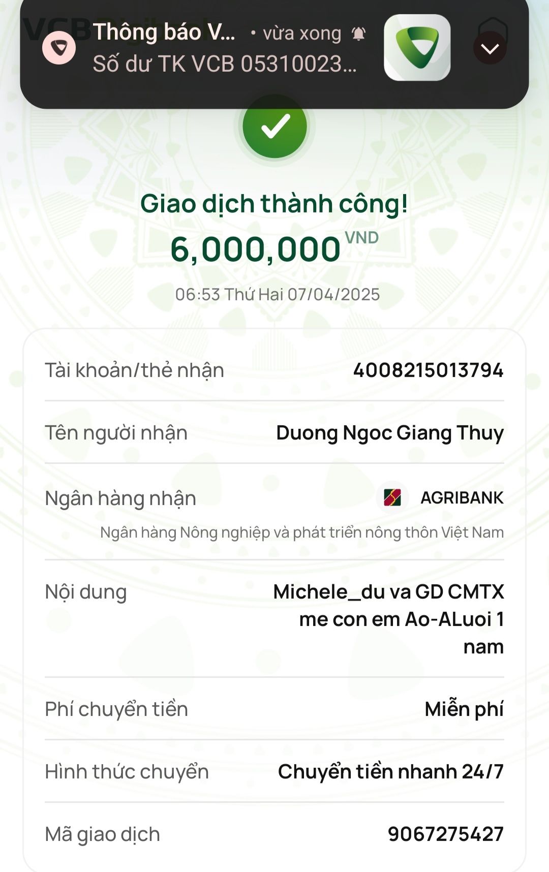"Agribank: 22h39p 04/01 TK 4008215013794: +2,000,000VND Nhom Love Elaniz giup gd a Ho Van Vien quy 1 2025 chuc Tet. "