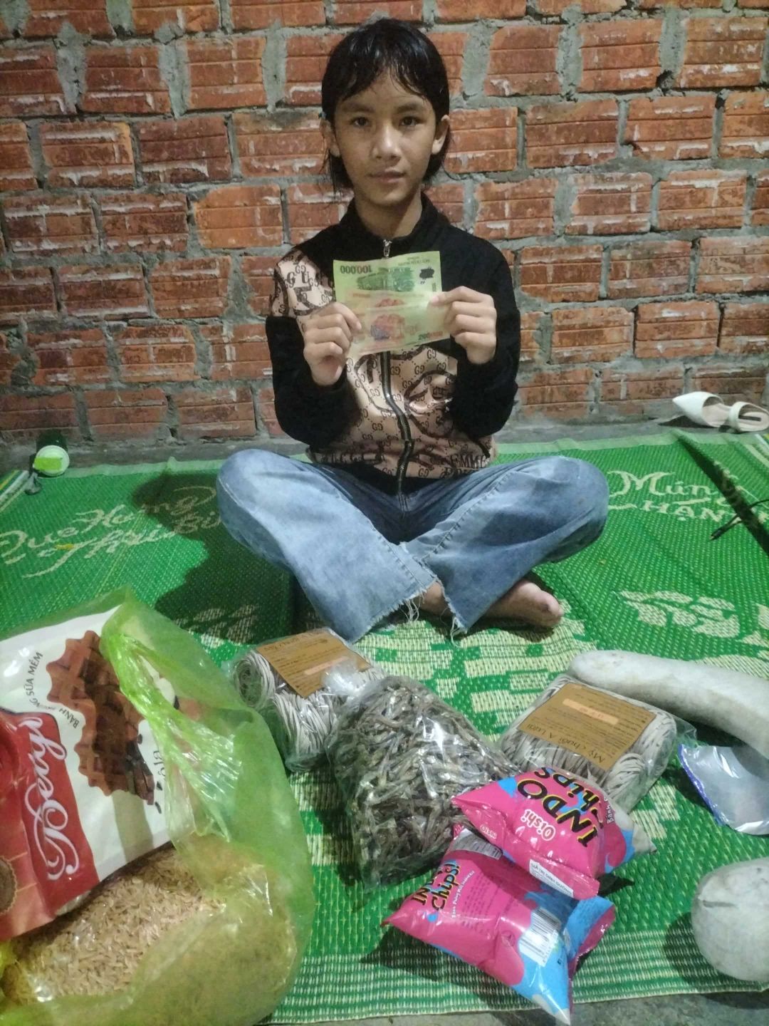 E cũng trao thêm 500.000 đ CMTX t12: 100.000 gia vị, 150.000 đ mì, 100.000 đ trứng, 75.000 đ giấy vs , 75.000 đ cá