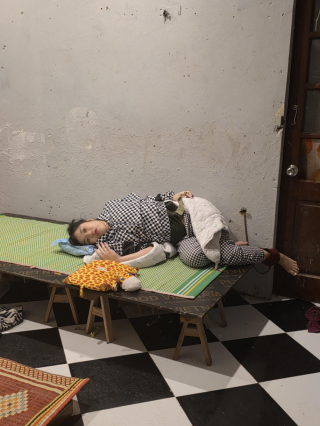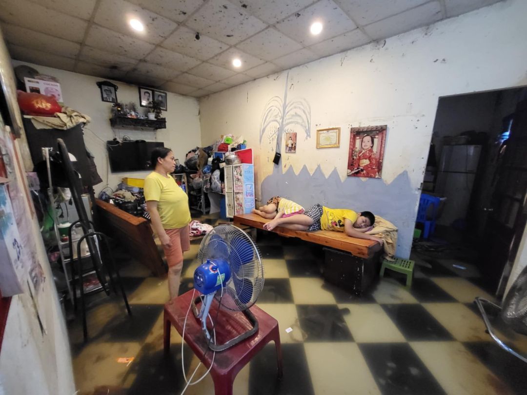 Mấy hôm trời mưa to, nước ngập vào tận trong nhà quá đầu gối, hàng xóm cho sang ngủ nhờ.