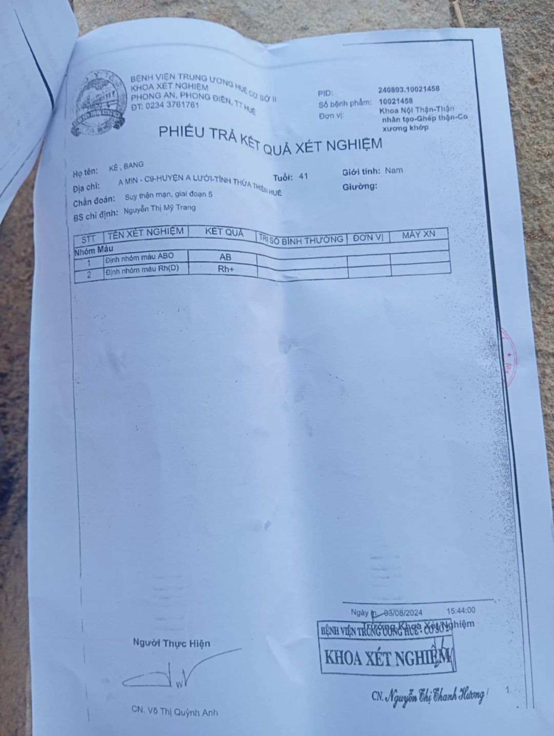 Anh hiện về chạy thận tại bv Tw Huế cơ sở 2 nên em trao người nhà anh