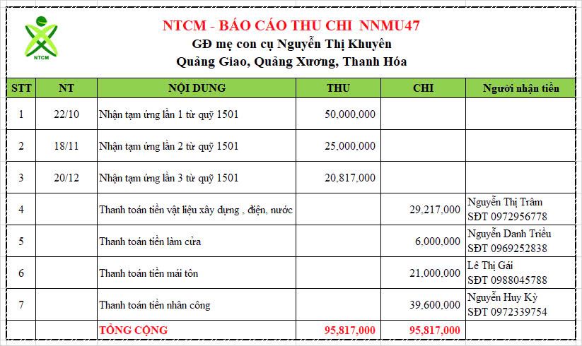 Cuối năm, việc huy động thợ xây dựng luôn là trở ngại lớn nhất trong xây dựng. Tuy nhiên, bằng tất cả những yêu thương, chia sẻ - NNMU47 của NTCM đã hoàn thành sau chưa đầy 2 tháng thi công. Từ nay về sau, gia đình bà Khuyên và con trai ở thôn Việt Trung, xã Quảng Giao, huyện Quảng Xương, Thanh Hoá sẽ có cuộc sống dễ chịu hơn trong căn nhà mới, đảm bảo công năng cho người mẹ dị tật và người con có chút vấn đề về trí tuệ.
