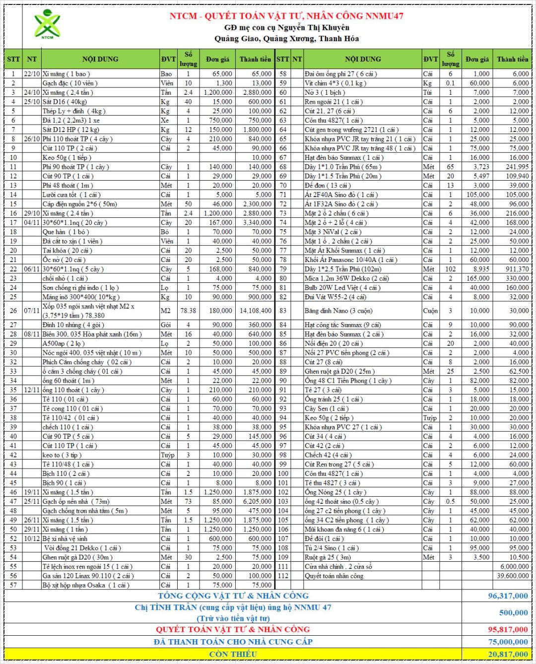 Quyết toán vật tư và nhân công: 95.817.000đ