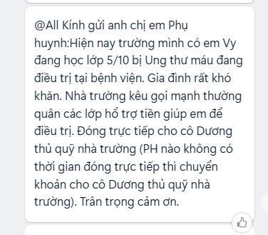 Thông qua trường của con mình là trường Huỳnh Văn Chính - quận Tân Phú, mình biết đến hoàn cảnh của cháu Vy, học sinh lớp 5/10, đang phải chiến đấu với căn bệnh ung thư máu và đang điều trị tại bệnh viện. Hoàn cảnh gia đình cháu khó khăn, đặc biệt khi cháu cần điều trị lâu dài và chi phí ngày càng tăng.