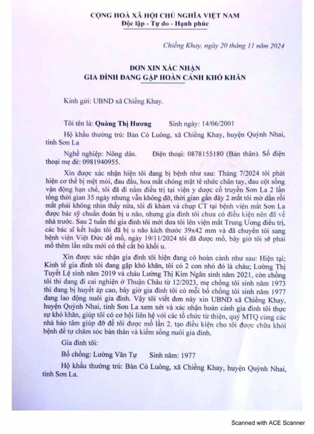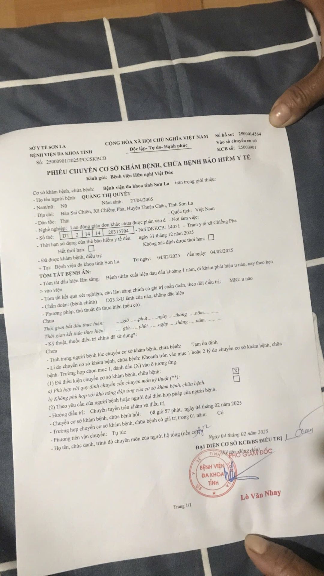 Có Phát sinh 1 chuyện buồn hơn nữa như sau:  EM ruột cháu Hương, tên là QUYẾT cũng bị đau đầu nhiều. Hôm Quyết đang chăm chị gái ở Viện SL thì đau quá, nên đã khám luôn tại BV Sơn La.
