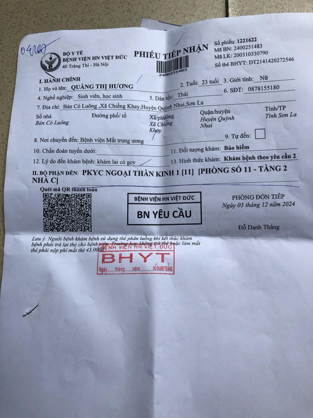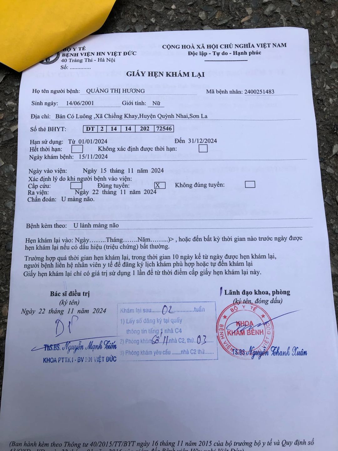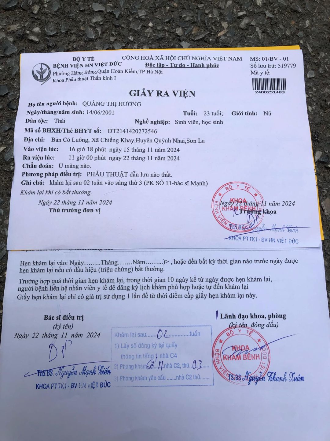 5h sáng qua HBL đã đến bv Việt Đức hỗ trợ cháu Quyết ( em ruột của Hương ) làm thủ tục, đi chiếu chụp … đến 15h30 ĐÃ NHẬP viện, vào Khoa: thần kinh 1.