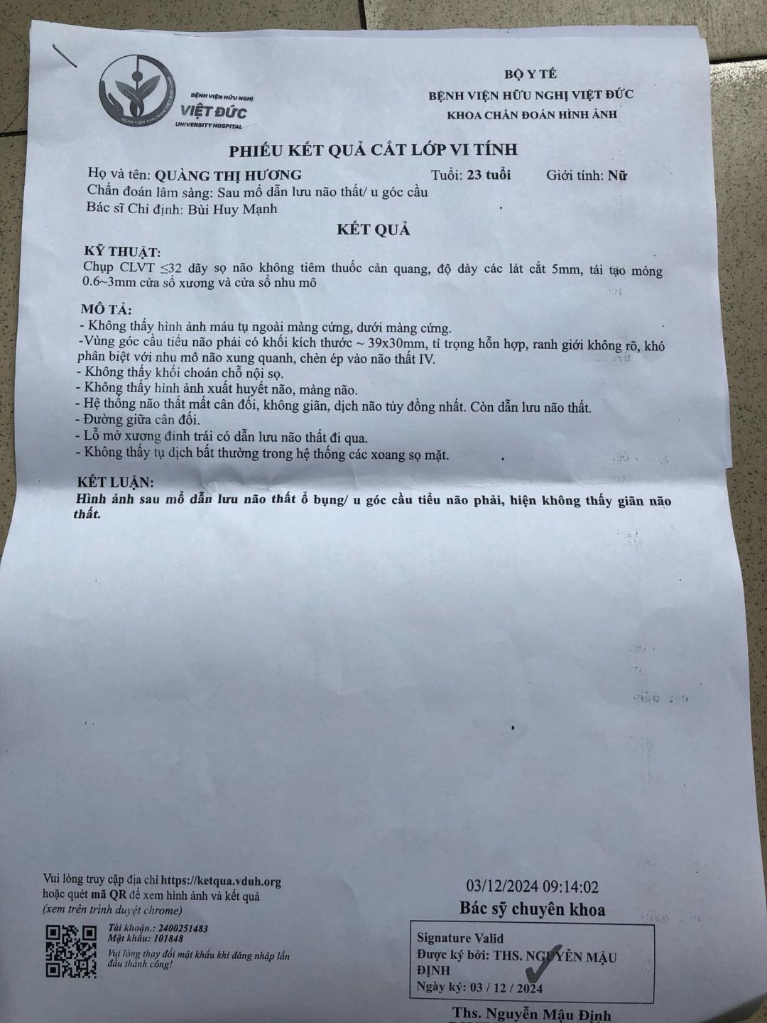 Cháu đã rút chỉ và kiểm tra tình hình sau ca mổ dẫn lưu não thất lần trước. Kết quả ổn định.