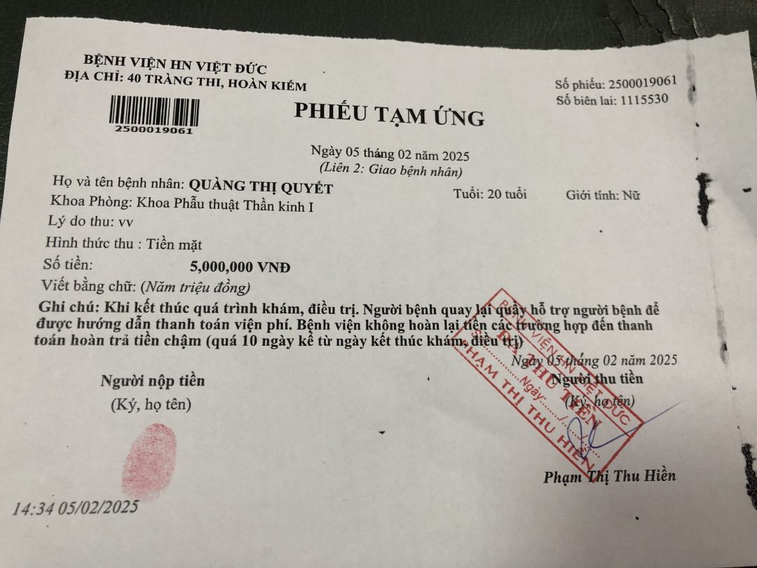 Lúc thấy HBL đến, nhân viên trong khoa nhắc đóng thêm tiền tạm ứng. HBL đã nộp thêm 5tr