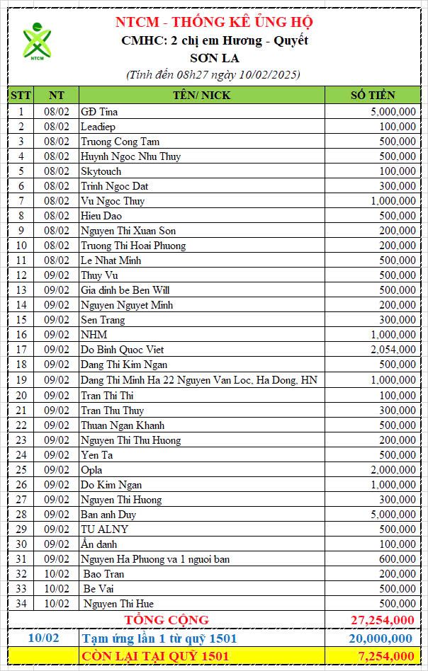Em xin gửi thống kê ủng hộ tính đến 08h27 ngày 10/02/2025, số tiền: 27.254.000 đ