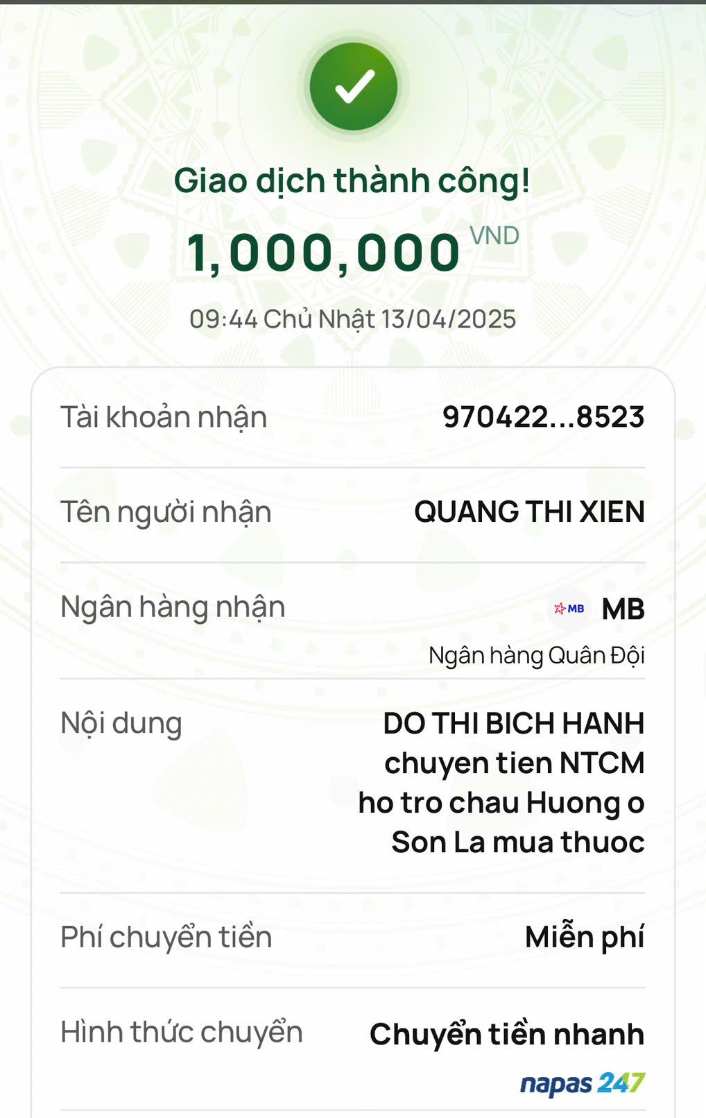 Ngày 09/7/2025: 1.000k ( để 2 mẹ con xuống bv VĐ )