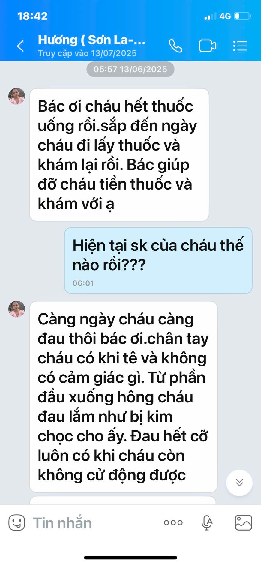 Sáng hôm qua ( 14/3 ) cháu lại nhắn tin: SK yếu quá, đau ko ngủ, nhiều lúc ko dậy được ... và cháu muốn xuống BV Tỉnh Sơn la khám và nằm điều trị ( Bv cách nhà ck cháu 130km ). Bên BV Việt ĐỨC năm 2024 có hẹn cháu Tết nguyên đá xong thì xuống Tái khám, nhưng rồi con cháu sôt và em gái lại bị mất, cháu chưa xuống khám lại. Và nhà cũng là người mới nên chưa xuống VĐ được. Nay cháu xin Diễn đàn giúp đỡ để cháu được xuống khám và nằm ở Tỉnh Sơn La.