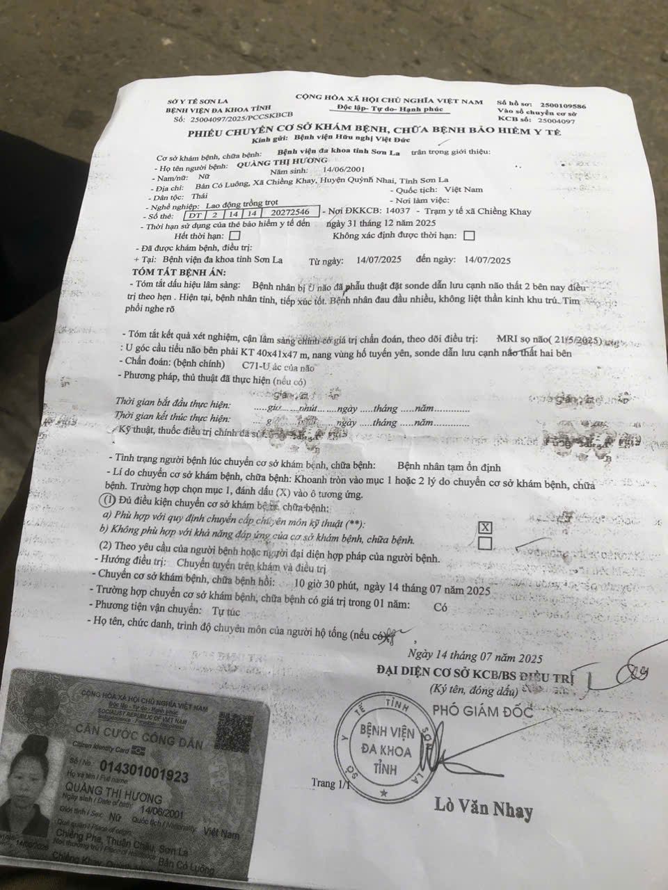 5h sáng ngày thứ 3 (15/7 ) mẹ con cháu Hương đã tới Bv Việt Đức, đã khám ở ngoài phòng khám, bác sỹ có nói: "nếu đồng ý Mổ thì mới nhập viện. Nếu không đồng ý thì bsy kê thuốc để về mua uống thôi ". Bsy không cho làm các xét nghiệm lại ( vì sáng 14/7 cháu Hương đã khám, làm các xét nghiệm chiếu chụp tại Bv tỉnh Sơn La; Bsy ở VĐ chỉ cần xem các kết quả ở Bv SL thôi ).