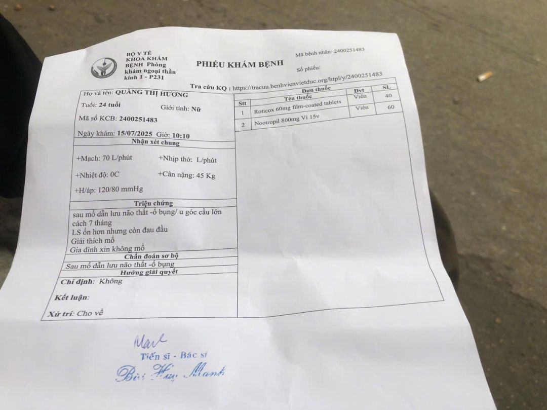 Gia đình cháu chưa dám cho mổ, đợi T01/2026 chồng cháu Hương đi Cai nghiện về thì 2 vợ chồng tự quyết định.