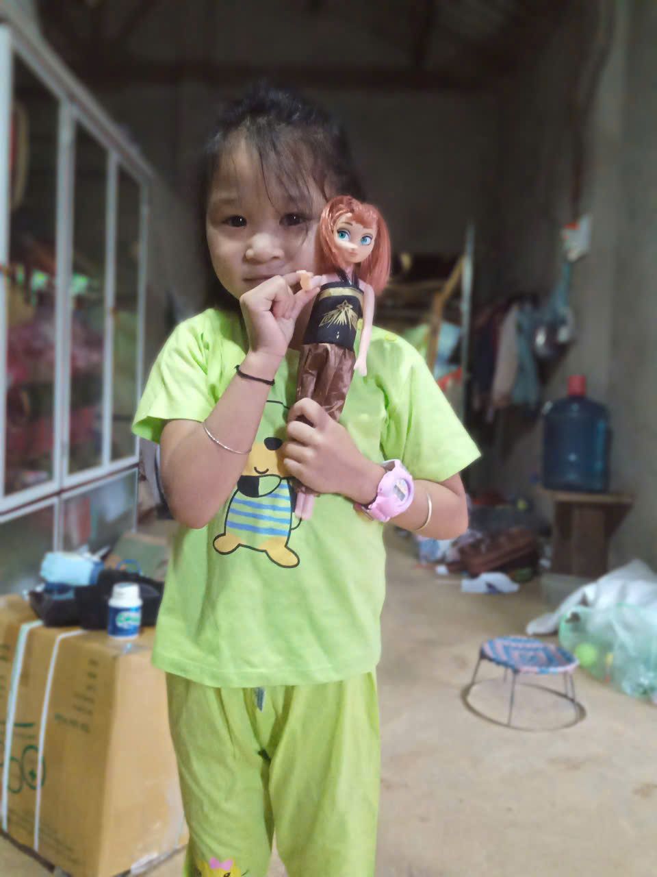 HBL tặng 2 bộ quần áo mới cho 2 con gái và Váy tím là váy cũ. Cô chị cả mặc hộ em gái ( vì em đang ở nhà ông bà nội trông giúp; còn Hương và bé lớn ở tạm bên ngoại để còn uống thuốc )