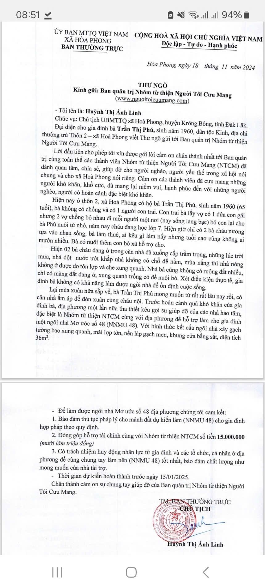 UBMTTQ VN xã Hoà Phong, huyện Krông Bông, tỉnh Đăk Lăk đã có thư ngỏ xin kinh phí xây dựng NNMU 48, cũng như đã đối ứng 15 triệu đồng chung tay xây dựng.