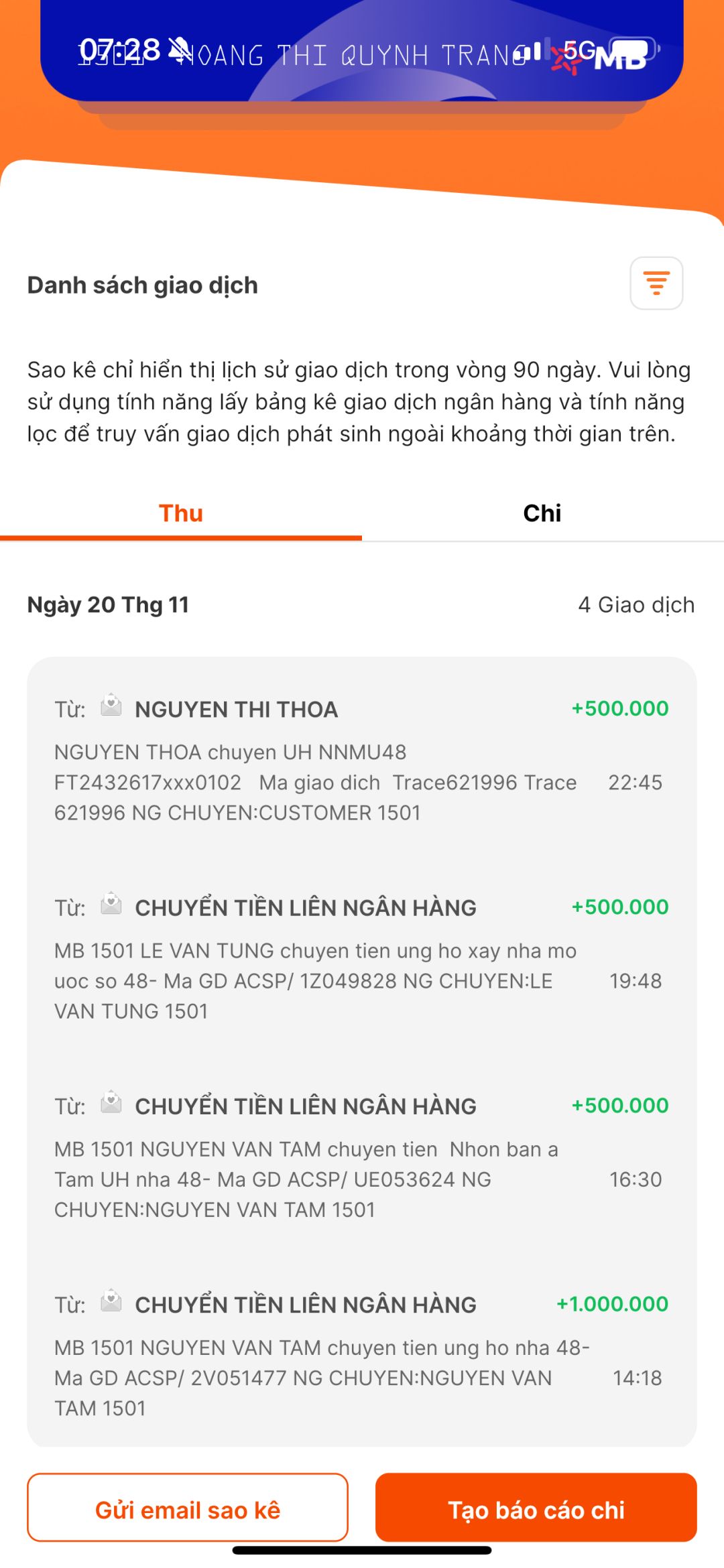 Số tiền ủng hộ trong ngày 20/11/2024 ạ: