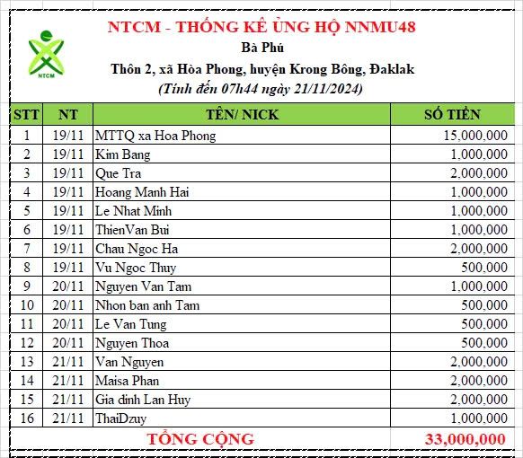 Cập nhật số tiền ủng hộ NNMU số 48 đến thời điểm hiện tại ngày 21/11 là 33.000.000 ( ba mươi ba triệu đồng chẵn ) . Xin chân thành cảm ơn