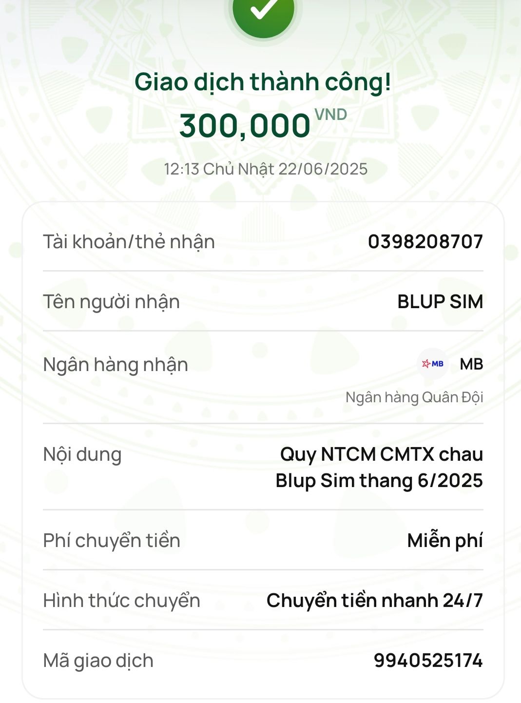 6x đã nhận được 900,000₫ từ quỹ NTCM và chuyển tới cháu @Blup_sim 300,000₫ tiền CMTX tháng 6/2025.