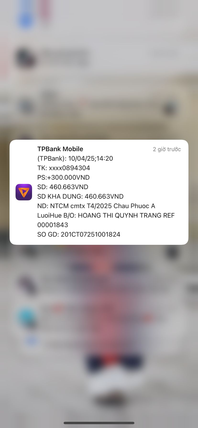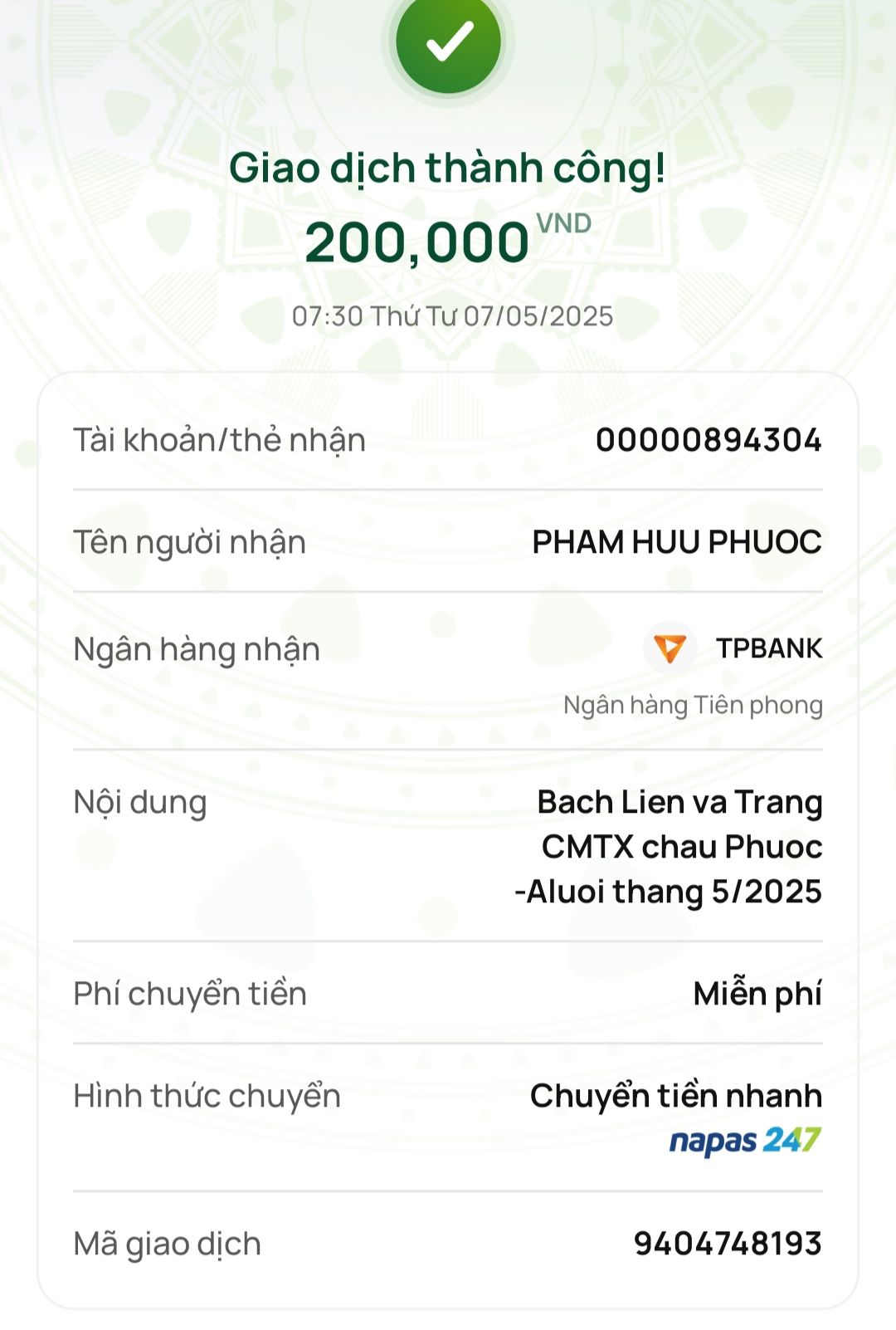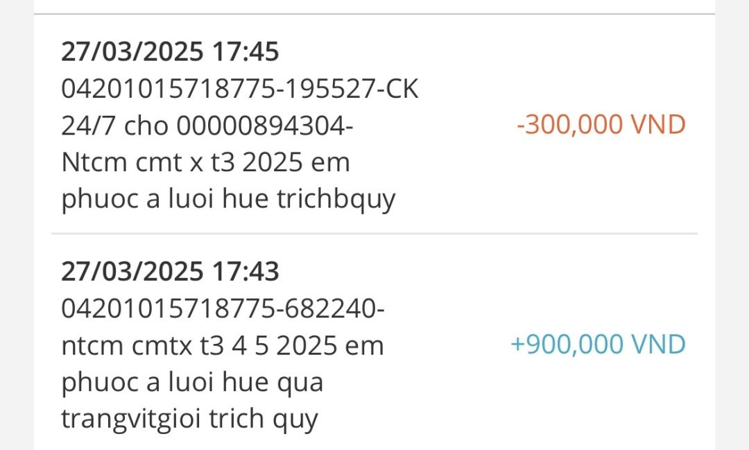 @trangvitgioi : Em xuất quỹ NTCM 900,000₫ tiền CMTX cháu Phước 3 tháng kể từ tháng 3/2025 .Tiền này chuyển về tài khoản trung chuyển cá nhân của Vịt để hàng tháng chuyển tiền cho hoàn cảnh cháu Phước dùm nhé.