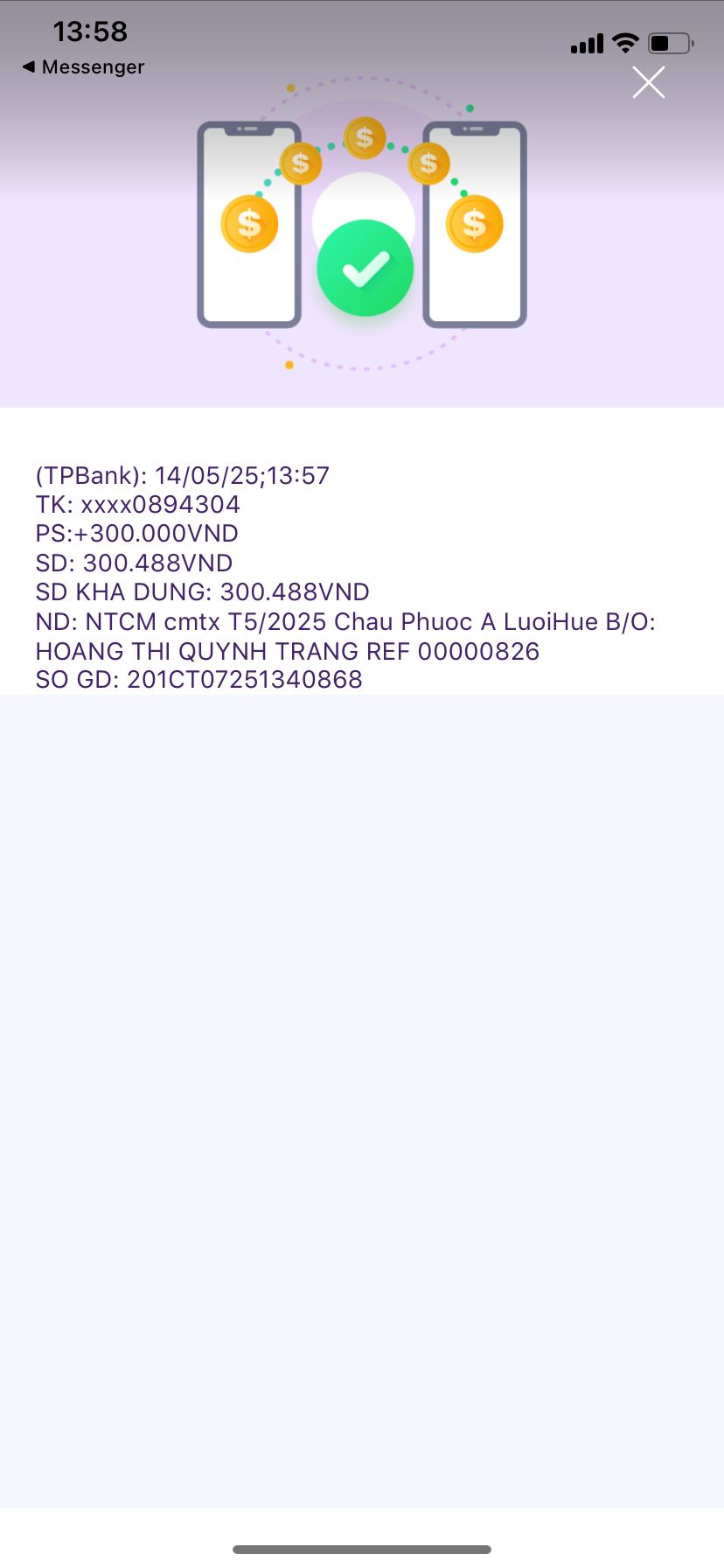 Trích dẫn của: banbe6x vào 27-03-2025 08:28:31@trangvitgioi : Em xuất quỹ NTCM 900,000₫ tiền CMTX cháu Phước 3 tháng kể từ tháng 3/2025 .Vịt đã chuyển xong 900k cmtx 3 tháng. Tổ điều phối xem xét tiếp tục trích quỹ cmtx tháng sau không nhé. Thanks.