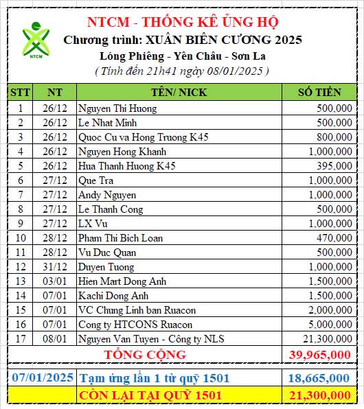 Em xin gửi thống kê ủng hộ chương trình tính đến 21h41 ngày 08/01/2025, số tiền: 39.965.000đ