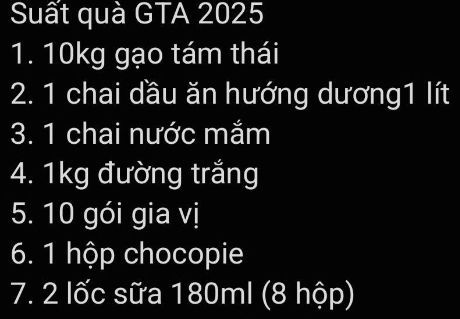 • Quà tặng: Mỗi gia đình 1 phần quà trị giá khoảng 01 triệu đồng gồm: 50% là nhu yếu phẩm (gạo, mắm, gia vị, dầu ăn, mì tôm, …) và 50% là tiền mặt