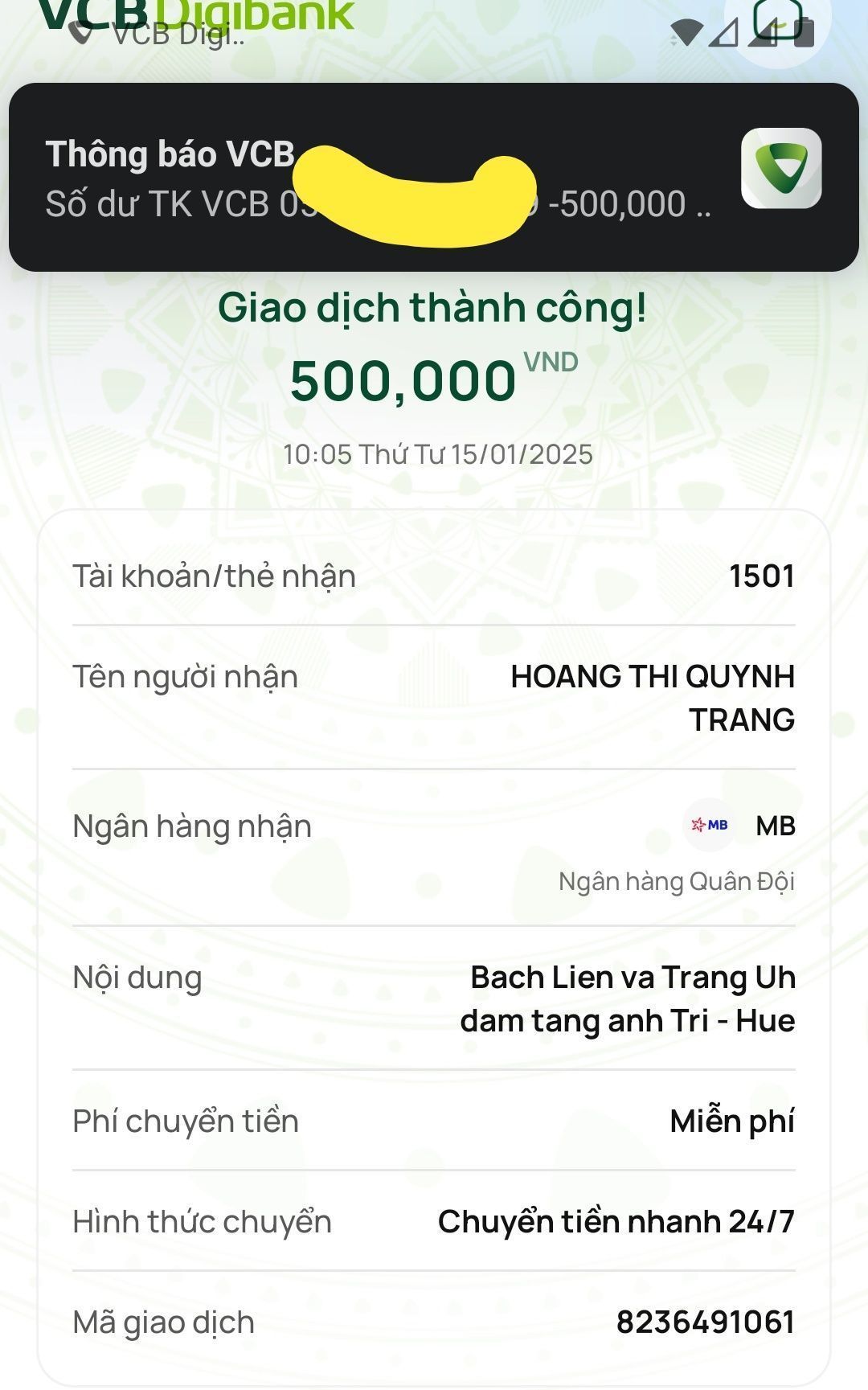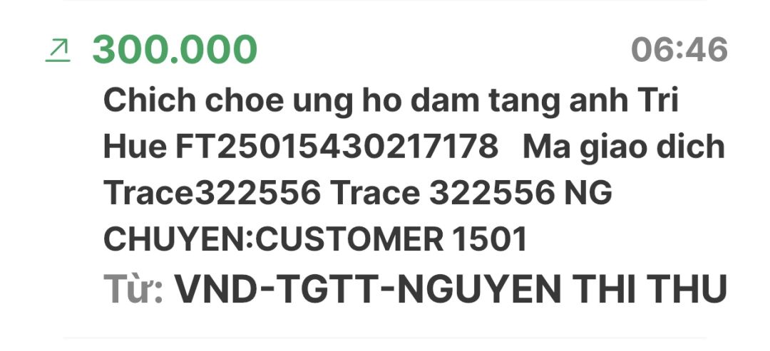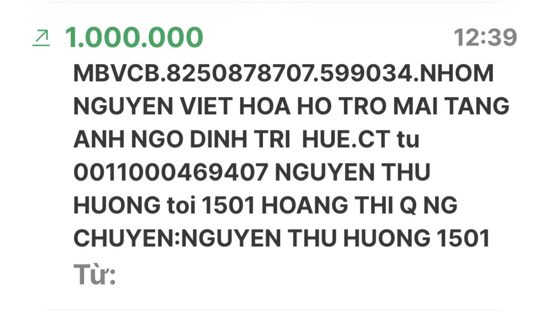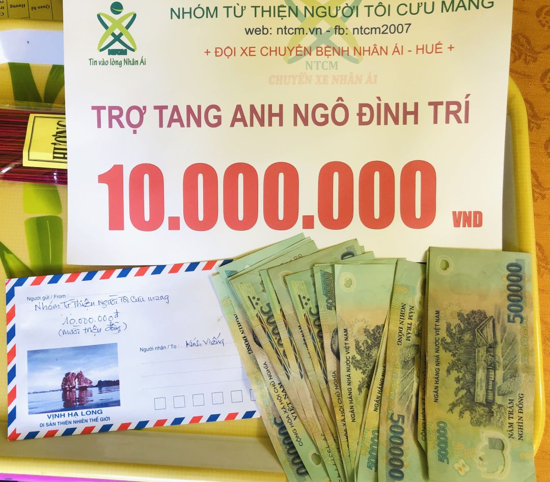 Số tiền ủng hộ Mai táng anh Trí 10.000.000đ, Quỹ đã chuyển tiền vào tài khoản VCB của chị Khánh Ly, nhờ chị check giùm em nhé. Mong anh về cõi giới an lành.