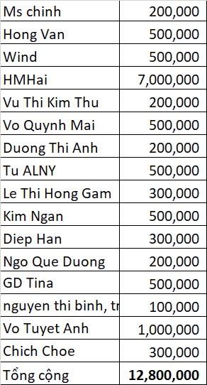 Số tiền 6,8tr quyên góp lúc chị H- Kẽm mất xin được chuyển sang CMTX 3 cháu; mỗi tháng 600 ngàn đồng và xin cưu mang thường xuyên trong 12 tháng-