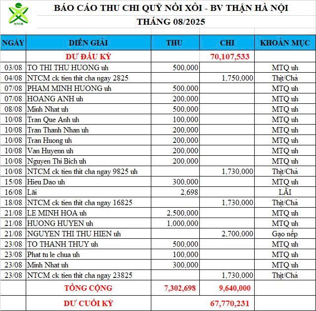 Em xin gửi Báo cáo thu chi Nồi Xôi - Bệnh viện Thận Hà Nội tháng 04/2025 đến tháng 08/2025.