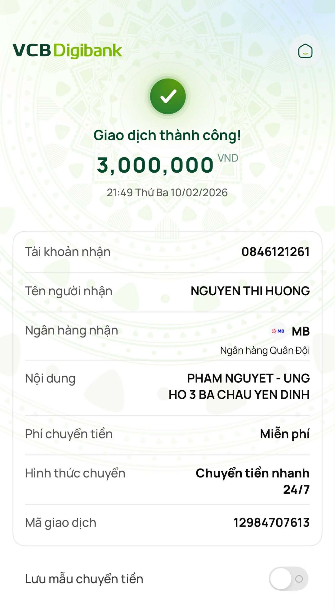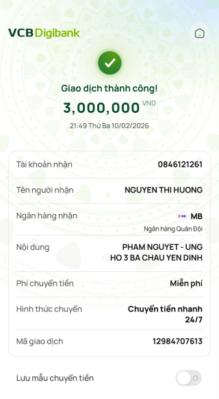 Mình đã chuyển 900k vào quỹ, nhờ chuyển đến hoàn cảnh dùm. Xin cảm ơn!