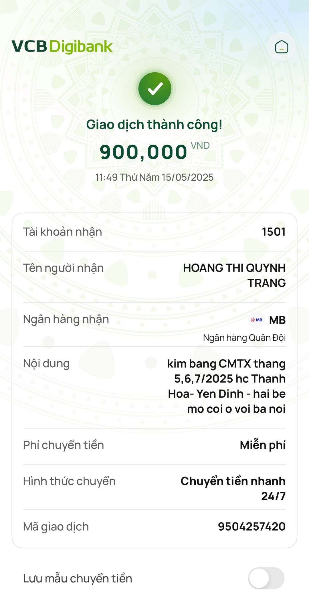 Mình đã chuyển 900k vào quỹ, nhờ chuyển đến hoàn cảnh dùm. Xin cảm ơn!