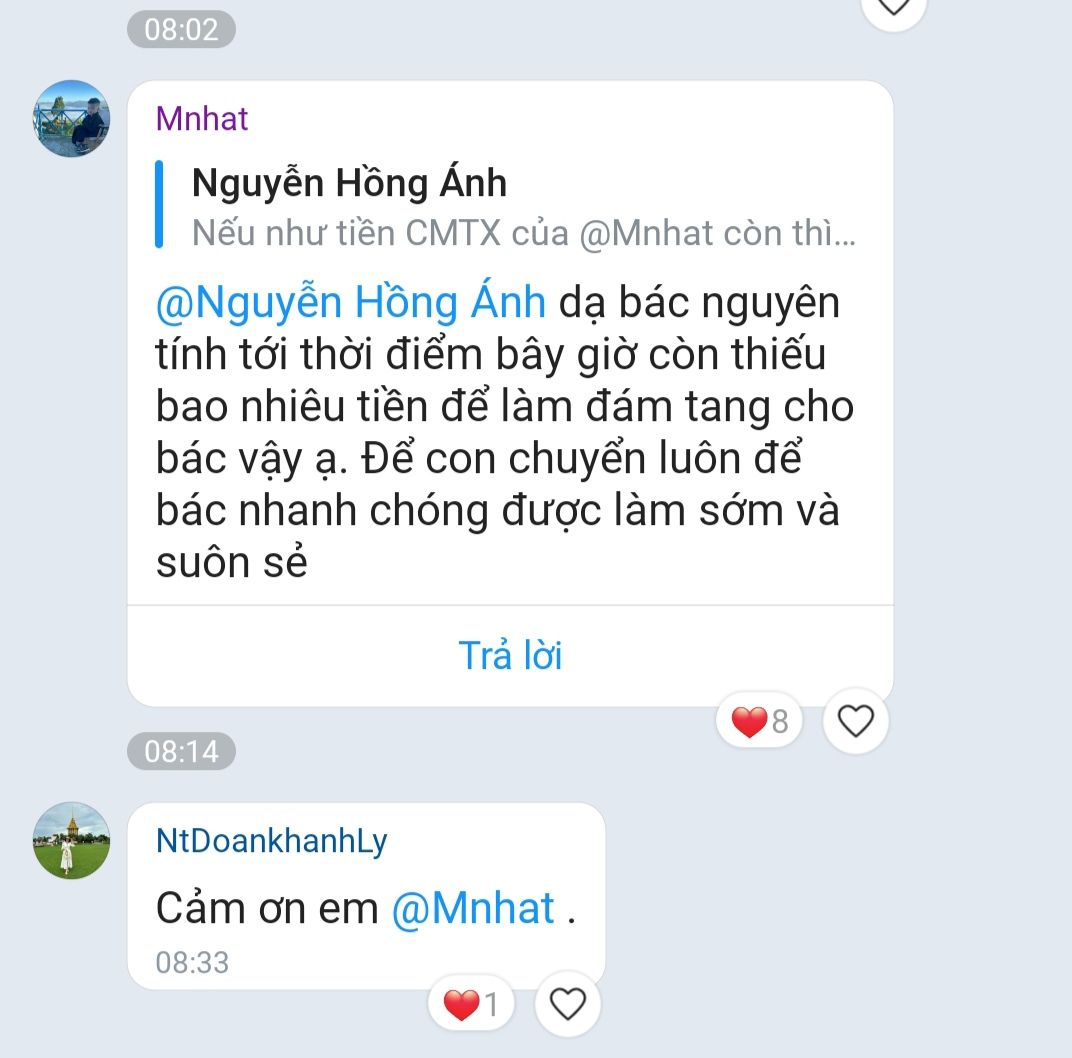Đề nghị tổ điều phối chuyển phần trợ tang cụ Nguyên cho nhóm Huế tiến hành qua tài khoản thành viên @Khánh Ly