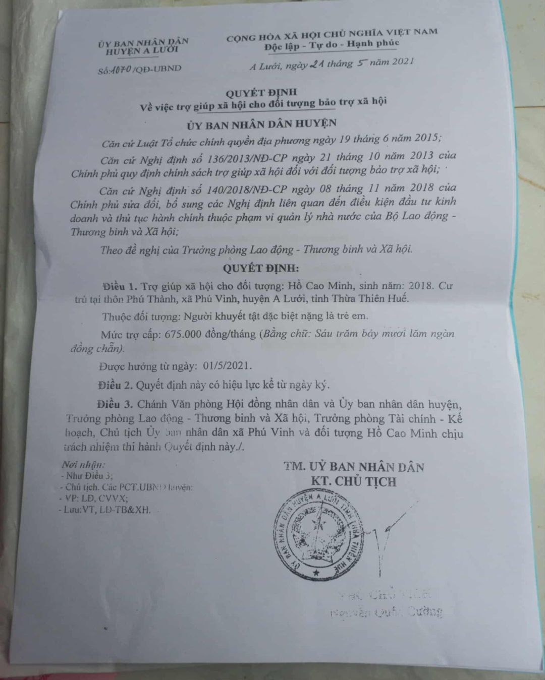 Cháu Hồ Cao Minh bị bệnh viêm não từ nhỏ do bệnh quá nặng nên cháu không nói được, đi không được,cháu chỉ bò và ngồi một chỗ, tay cháu vận động yếu, phải nhờ đến mẹ giúp đỡ về việc ăn uống và sinh hoạt hàng ngày.Mỗi tháng em về Bệnh viện Trung ương Huế tái khám.tiền thuốc và xe cộ đi lại gần 1 triệu . em được nhà nước hỗ trợ một tháng 1.200k mỗi tháng gồm trợ cấp cho cháu và tiền cho người chăm sóc cháu