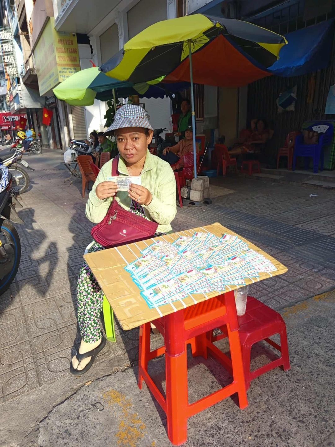 May mắn lần đến này gặp đúng lúc chị đang đi ra điểm bán vé số của 2 mẹ con.