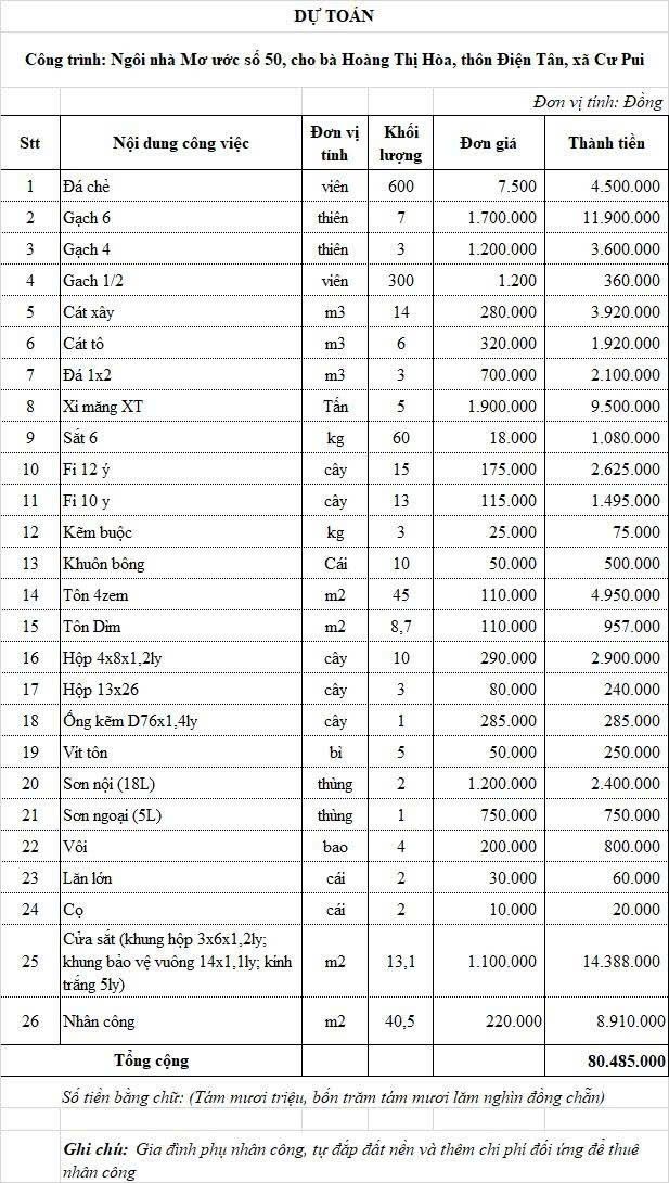 1) Bản thiết kế và dự toán kinh phí (qua trao đổi với anh Tâm thì tầm khoảng 80 triệu VND, có sai số chút xíu) như các NNMU khác