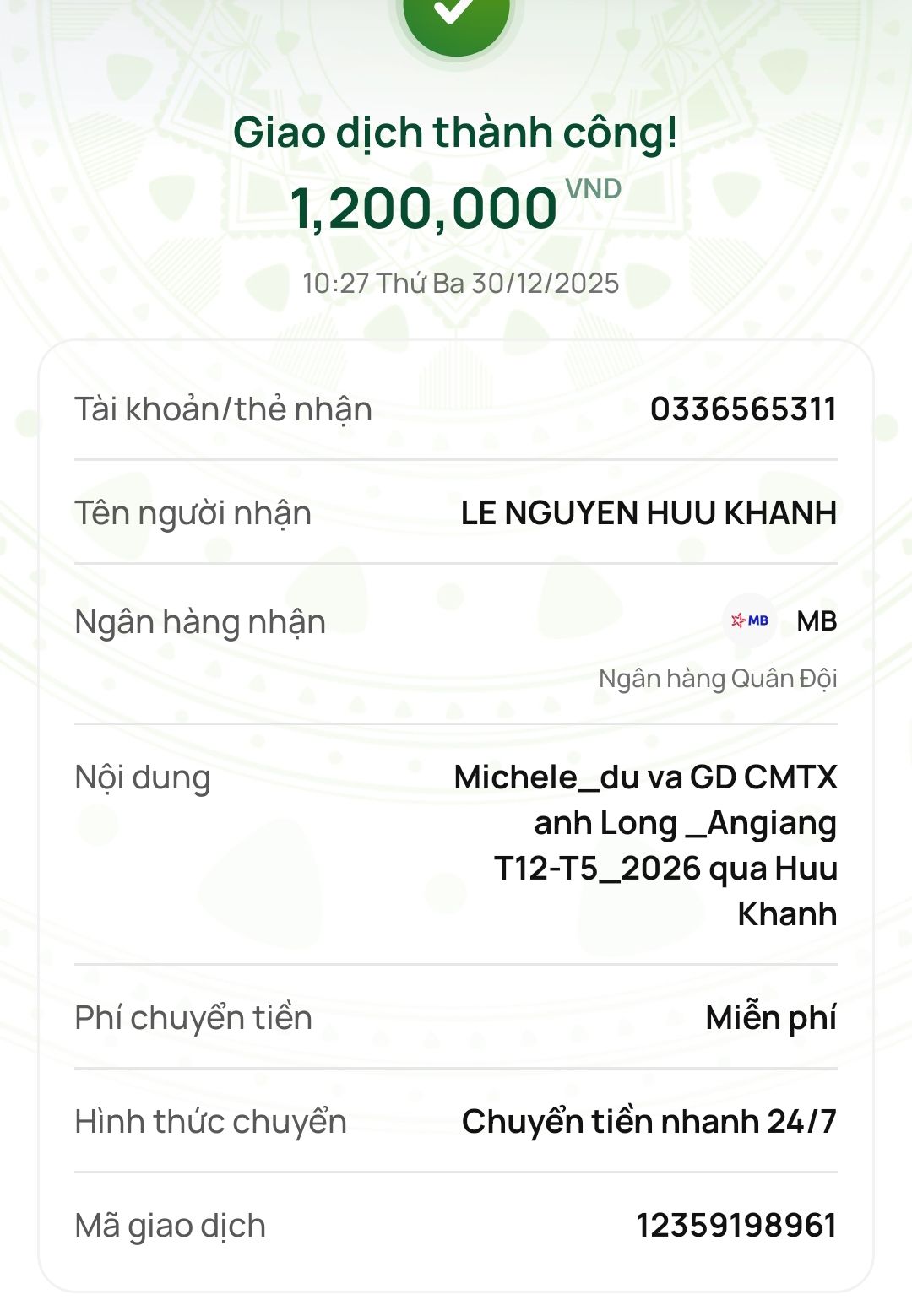Michele_du và Gia đình đã chuyển tiền CMTX anh Long từ tháng 12/2025 đến hết tháng 5/2026 qua tài khoản trung chuyển tiền của @huukhanh rồi các bạn nhé.