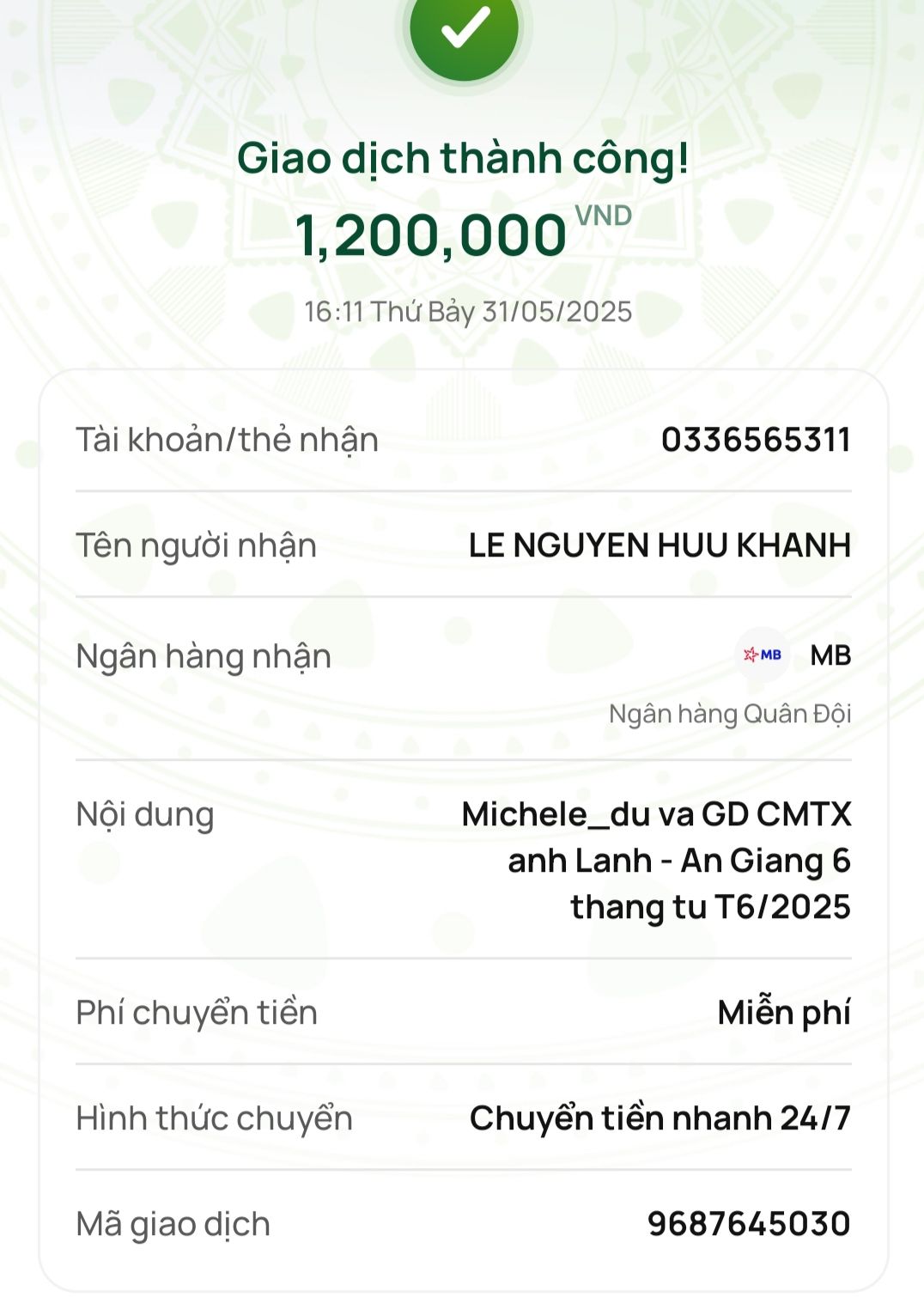 Cảm ơn @huukhanh đã nhận việc trung chuyển tiền tới anh Lãnh !