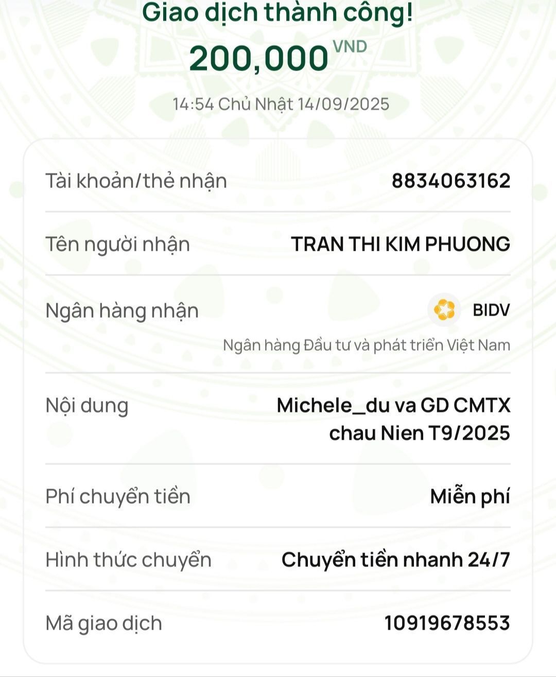 Cháu cập nhật vào hôm nay 21/10/2025 bà Phượng đã nhận được 200.000vnd của tháng 10/2025 từ Michele_du và GD CMT ạ  !