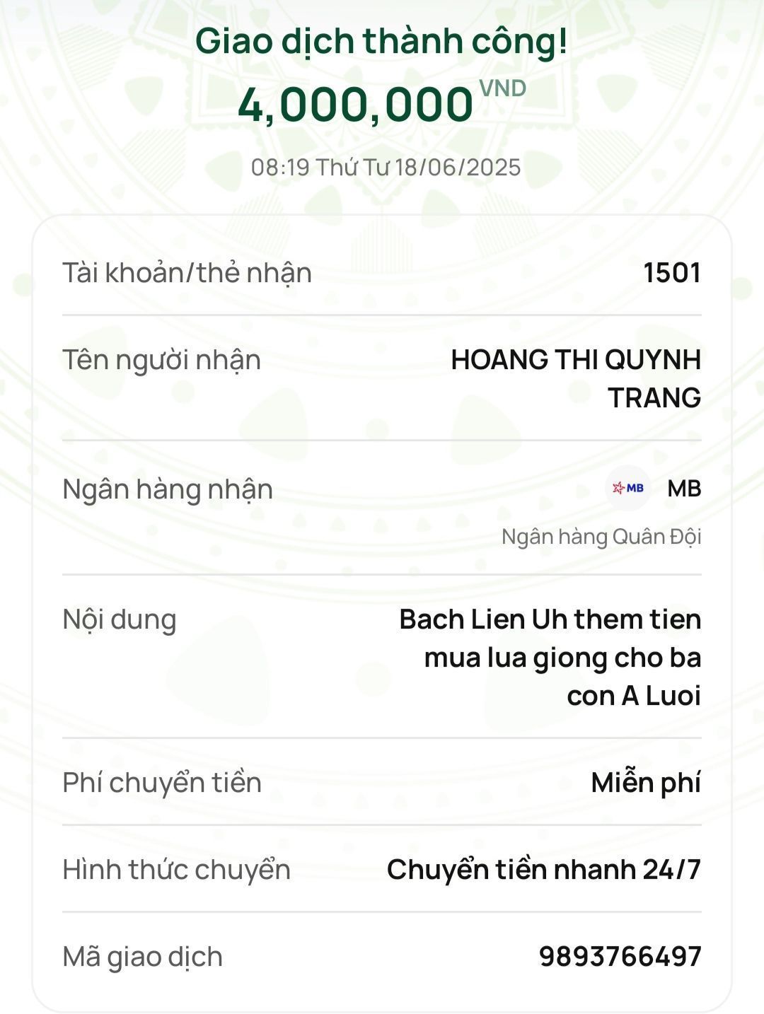 @Wendy Duong cùng với 8,000,000₫ của 2 chị Bạch Liên và Trang cho các bạn khu vực A Lưới mua lúa giống phát cho bà con xã Hồng Thủy như danh sách đã cập nhật.