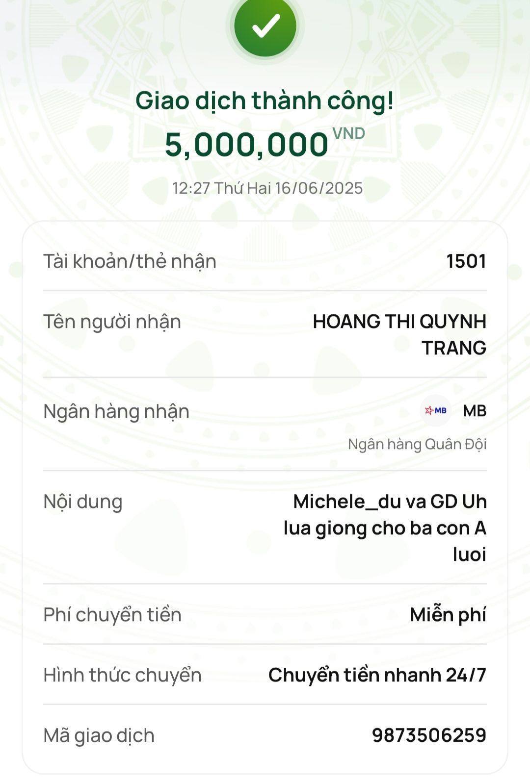 Chị Michele_du và Gia đình ủng hộ lúa giống cho bà con 5,000,000₫.