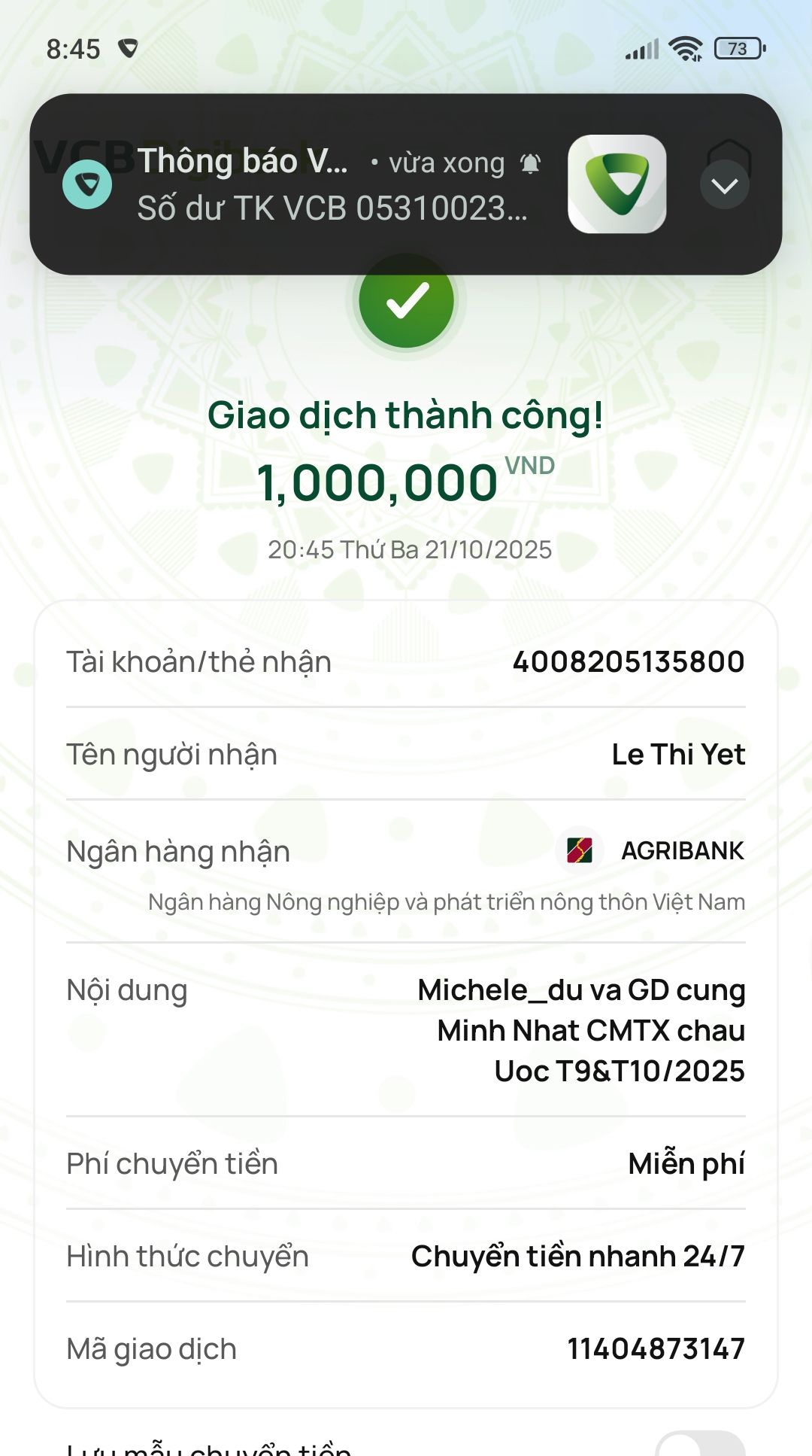 Tiền CMTX tháng 11/2025 từ Michele_du và Gia đình cùng Minh Nhật đã gửi tới người nhà cháu Ước.
