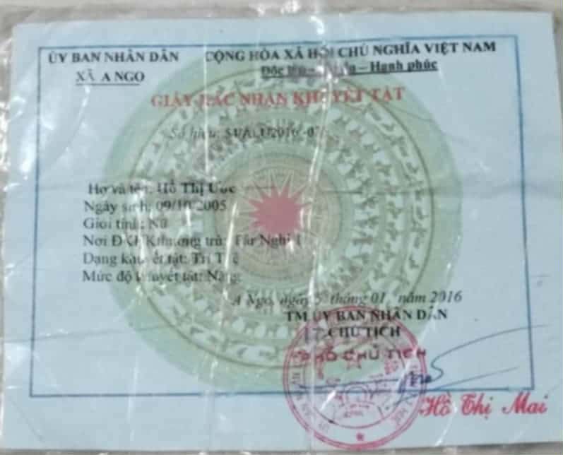 em HỒ THỊ ƯỚC, sinh năm 2005, năm này em học lớp 12B7, em khuyết tật trí tuệ, bệnh tim, nhà hộ nghèo, mồ côi cha từ nhỏ được mự chăm nuôi.