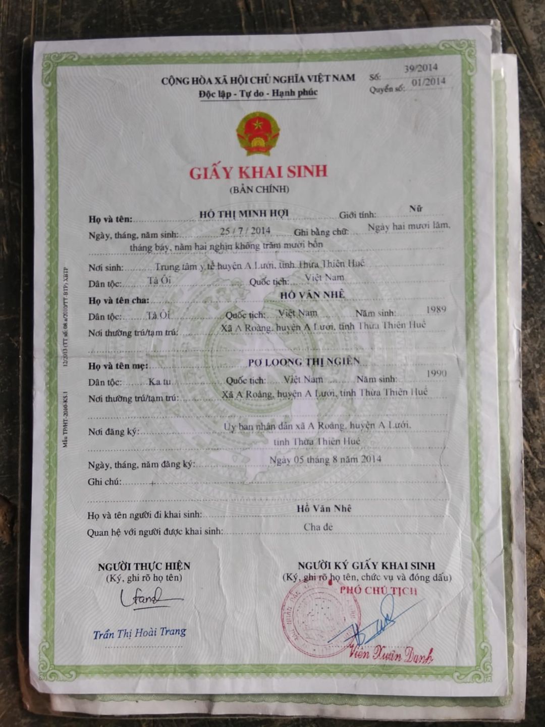 SN: 1990    35tuổi Ở thôn: Achi-hương Sơn. Xã A Lưới 4, T.P.Huế