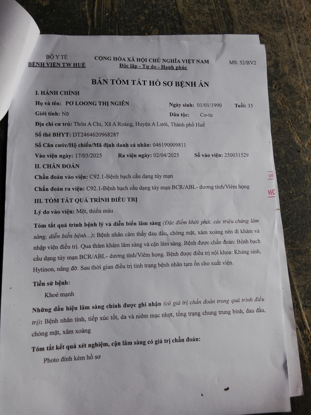 Chị đau từ ngày: 20/6/2021 bác sĩ phát hiện bệnh máu trắng, chị tại khám 2 tháng 1 lần trong 1 năm, mỗi tháng về tại khám, nằm viện 4 ngày. Giờ chị đau nặng từ ngày 23/6/2025 đến giờ. Gia đình thuộc diện hộ nghèo khó khăn.