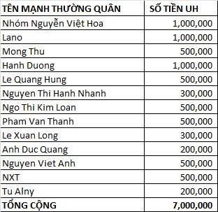 Theo thống kê của Loannguyen thì đến chiều ủng hộ 19.400.000đ + 2.000.000đ phúng điếu người thân thành viên. Quỹ đã chuyển 21.400.000đ cho bạn Blup Thin, nhờ bạn kiểm tra và gửi gia đình giúp.