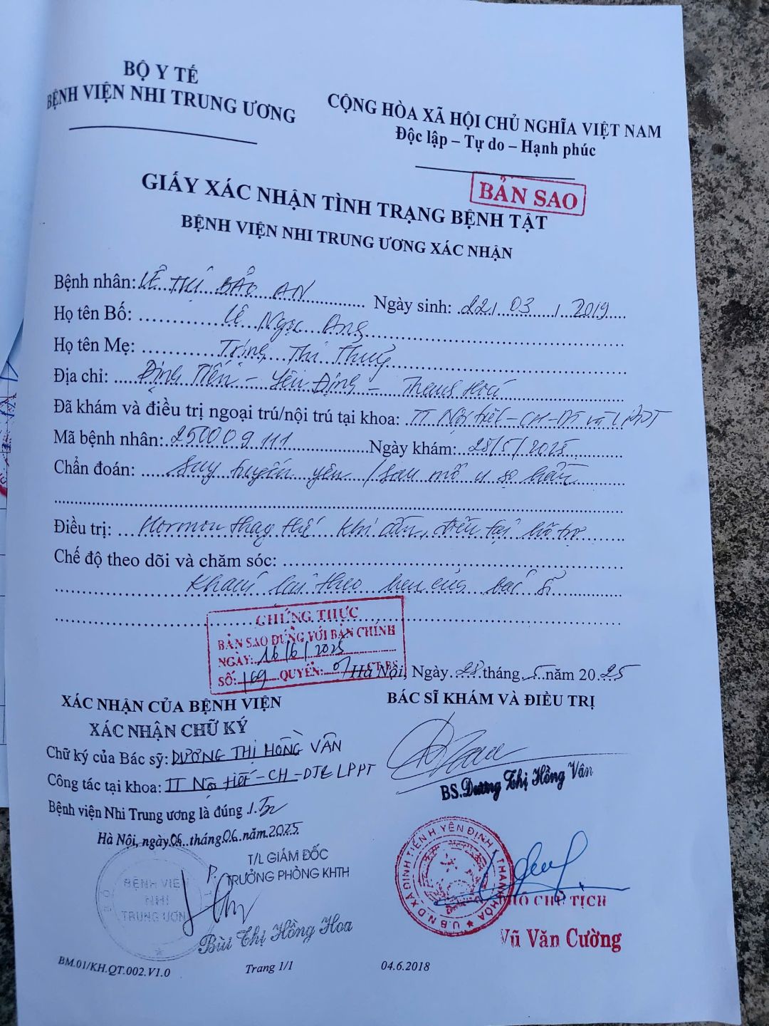 Sau khi được can thiệp não thì cháu bị tổn thương tuyến yên, hiện theo điều trị của bệnh viện cháu phải điều trị tuyến yên trước.