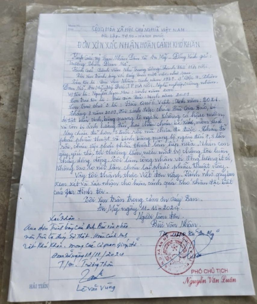 Vợ chồng tôi đều là công nhân. Tôi làm nghề in, còn vợ tôi (sinh năm 2000) làm nghề may. Thu nhập hàng tháng của hai vợ chồng chỉ khoảng 15–16 triệu đồng, vừa đủ để chi tiêu tối thiểu, chưa kể đến các khoản điều trị cho con.