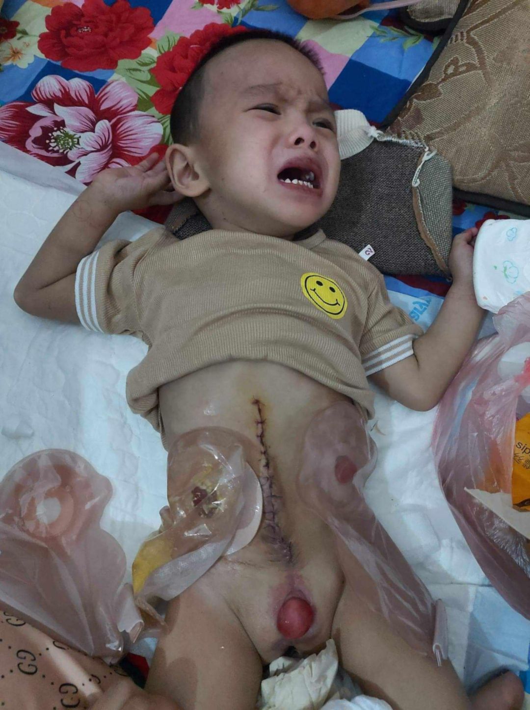 Con trai tôi là Bùi Gia Bảo, sinh năm 2019, không may mắc phải dị tật bẩm sinh phức tạp: bé bị bàng quang lộ ngoài, không có hậu môn, không có bộ phận sinh dục, và bàn chân phải bị khoèo. Từ khi chào đời đến nay, bé đã trải qua 11 lần phẫu thuật tại Bệnh viện Nhi Trung Ương Hà Nội. Hiện tại, bé vừa mới mổ chân và đang được chăm sóc, điều trị tại nhà. Bé có bảo hiểm y tế, nhưng chi phí đi lại, ăn ở, thuốc men ngoài danh mục vẫn là gánh nặng lớn đối với gia đình tôi.
