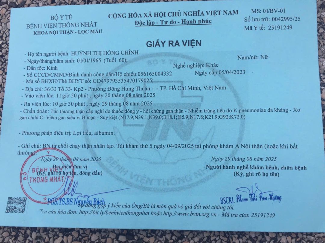 Tuần trước bà nằm thống nhất. Vì không có tiền chạy thận nên đưa về Mái Ấm ở quận 6 nhưng vì bà không đi vệ sinh được nên mái ấm không nhận và bà cấp cứu ở bệnh viện chợ rẫy vào tối 30/9/2025. Hiện tại bà đang nằm ở khoa nội tiêu hóa bệnh viện Chợ Rẫy để hút dịch màng bụng và chờ các xét nghiệm